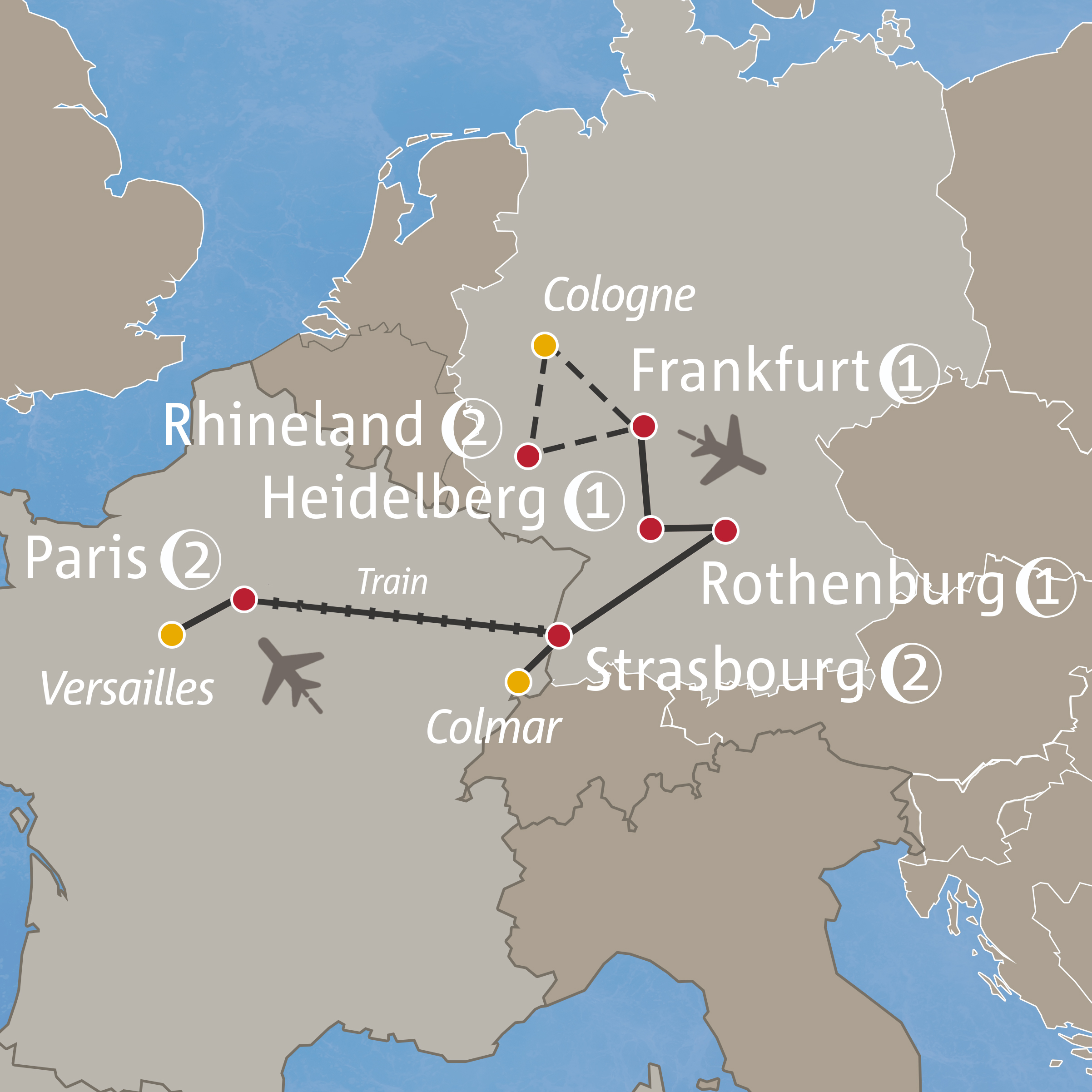 Travel through France and Germany, and extend your trip with an excursion to the Rhineland.