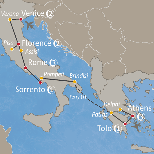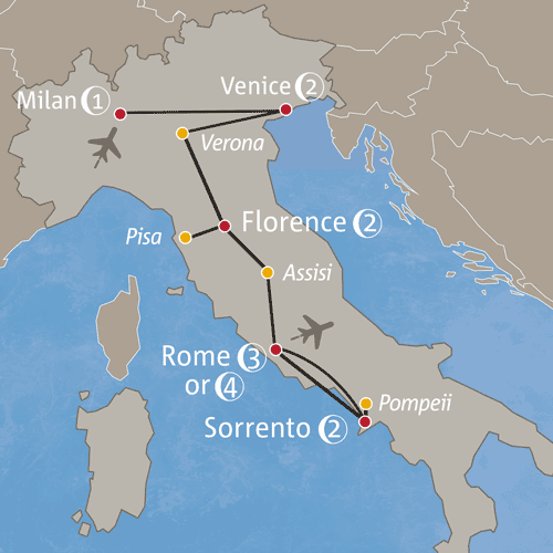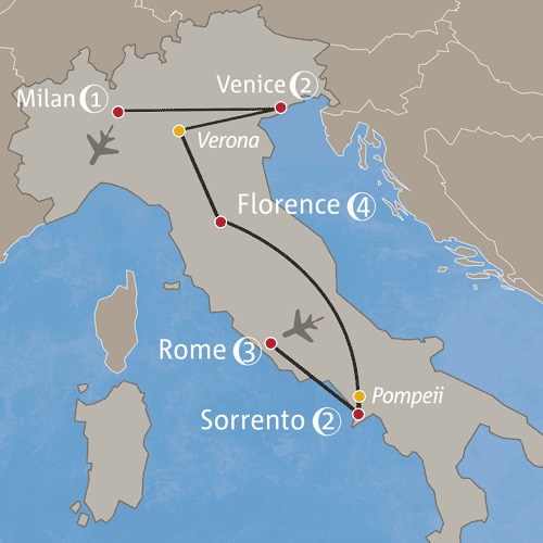 - Italy: Rome, Florence, Sorrento, Venice